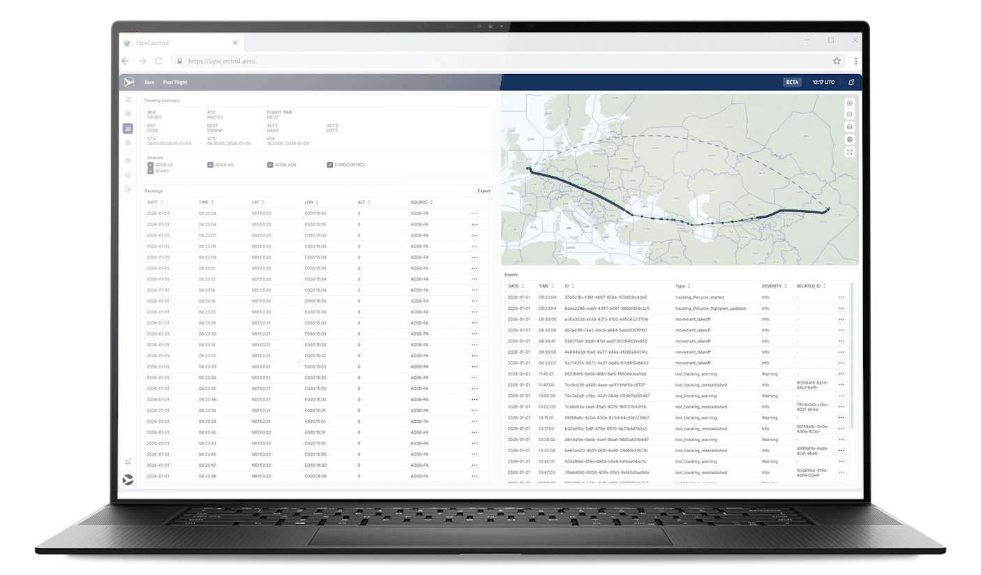 Accurate position reports and takeoff & landing events are transmitted directly from onboard systems.